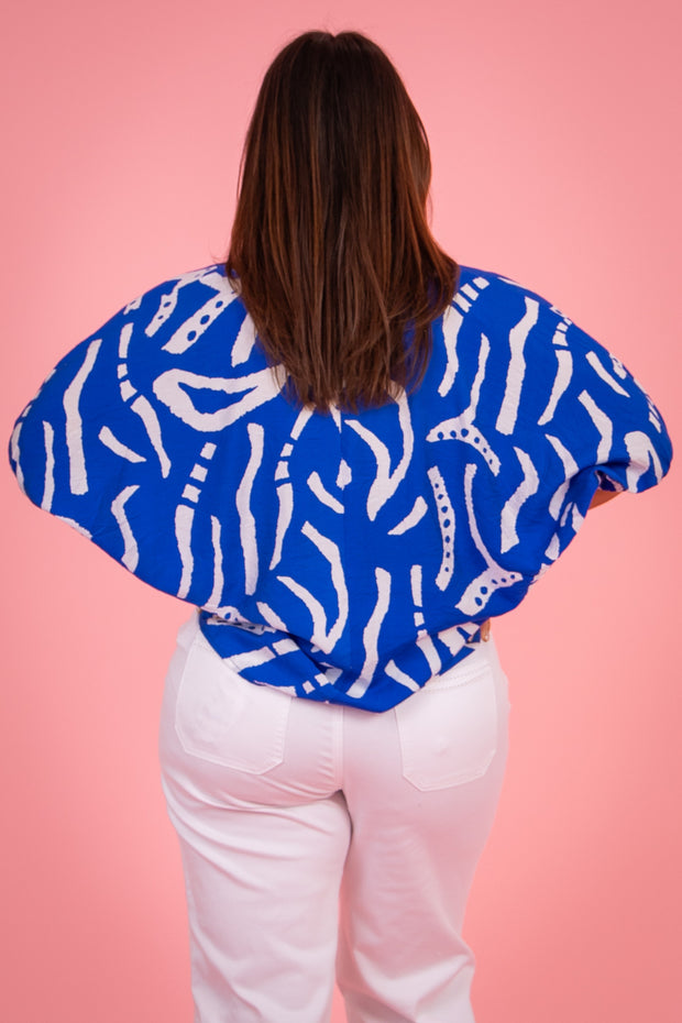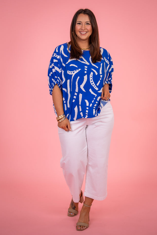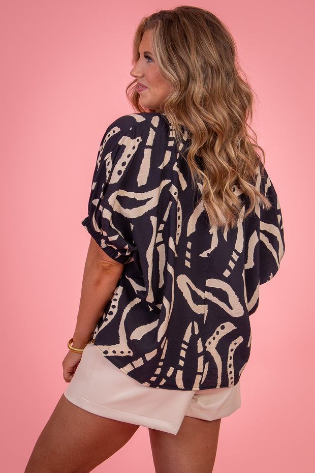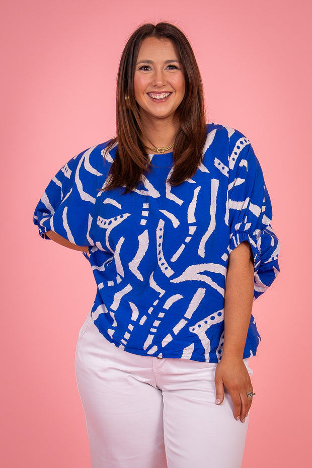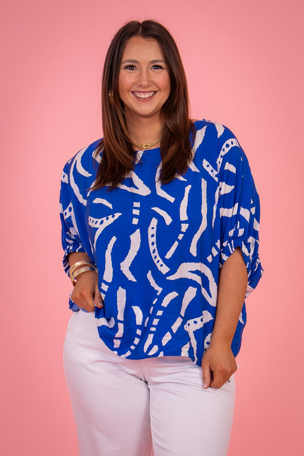 Expertly designed with a rounded neckline and short sleeves, the Give It Your All Top showcases a stunning abstract print. Crafted for comfort and style, this top is perfect for any occasion. Elevate your wardrobe with this must-have piece.