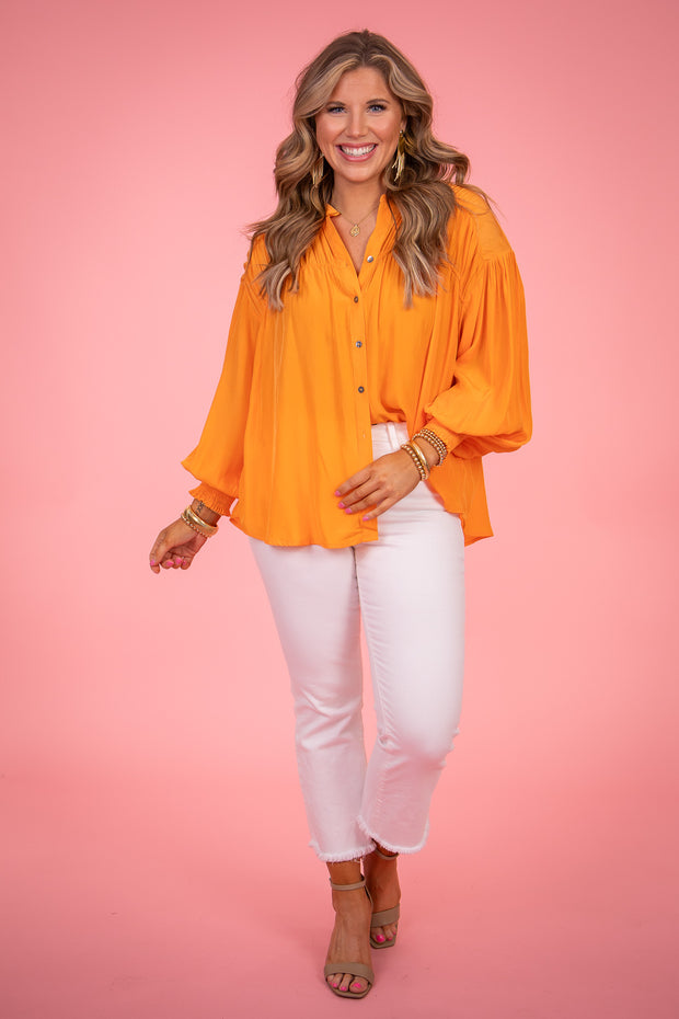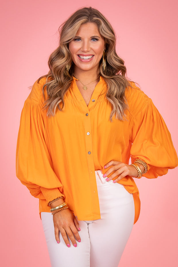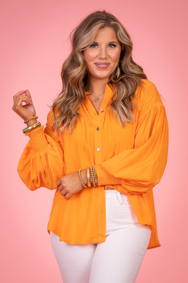 Expertly crafted with long sleeves, a button down front, and pleated detailing on the front, the Chasing Sunsets Blouse is the perfect addition to your wardrobe. This versatile blouse can be dressed up or down, making it a must-have for any occasion. Effortlessly chase the sunsets in style with this chic and timeless blouse.
