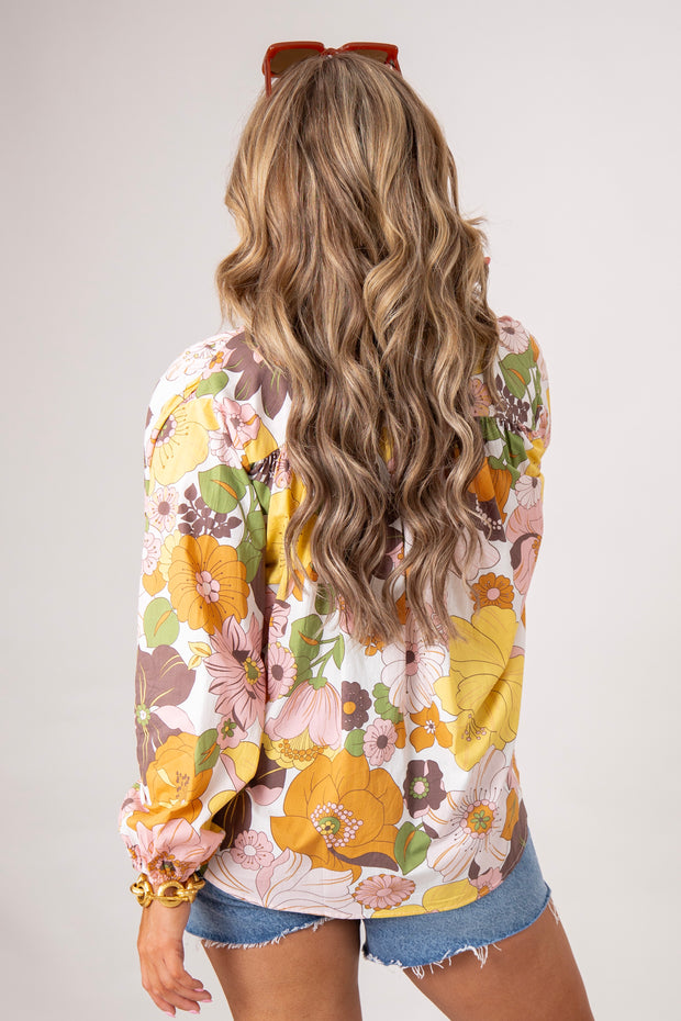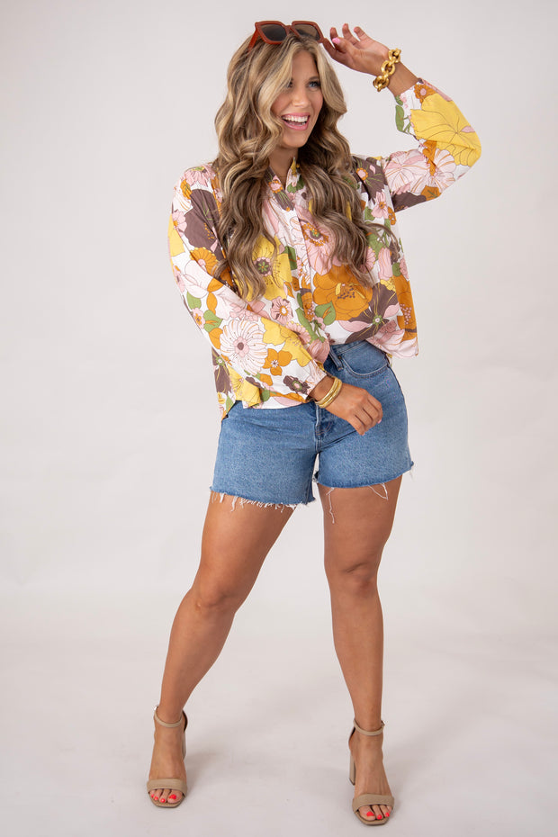 Introducing the Flower Shop Blouse - the perfect addition to your wardrobe. This button up top features a gorgeous floral pattern, complemented by a classic round neckline and long sleeves. With its versatile style and comfortable fit, this blouse is ideal for any occasion. Add a touch of elegance to your look with the Flower Shop Blouse.