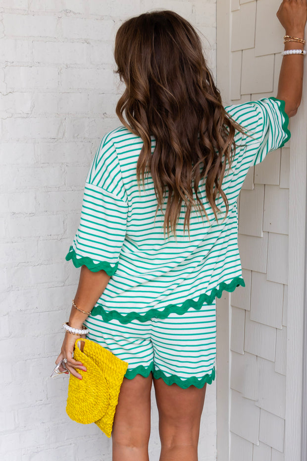 Introducing the On The Green Top. Made with a stylish striped print and a unique zig zag hem line, this top is perfect for any fashion-forward individual. With a classic button down front and a top collar, this top exudes both sophistication and style. Elevate your wardrobe with this must-have item.