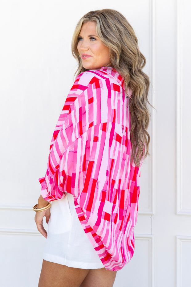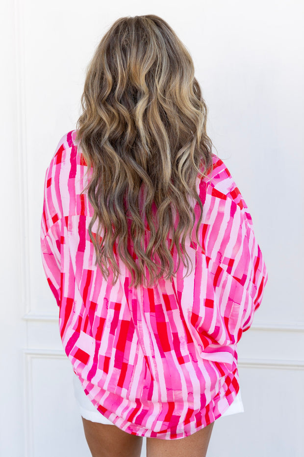 Elevate your style with our Passion For Pink Top. With a top collar, long sleeves, and a button down front, this top will add a touch of sophistication to any outfit. The abstract print adds a playful yet elegant touch. Perfect for any occasion.