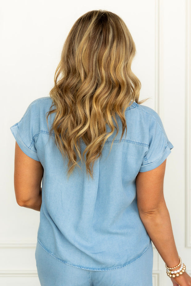 The Totally There Top is a must-have for any fashion-forward individual. Its light denim material and cuffed sleeves exude effortless style, while the round neck and flowy design provide ultimate comfort. Elevate your wardrobe with this versatile and trendy top.