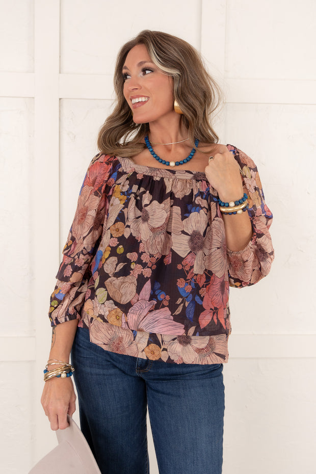 The Fields Of Flower Top features a square neckline and three quarter length sleeves, providing a flattering and versatile fit. Its beautiful floral print adds a touch of elegance to any outfit, while the inner lining ensures comfort and coverage. Upgrade your wardrobe with this stylish and practical top.