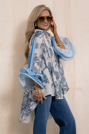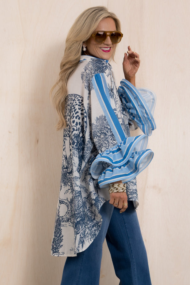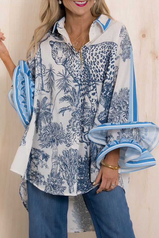 The elegant top collar and ruffled sleeves add a touch of sophistication, while the button down front provides convenience and versatility. One size fit ensures a perfect fit for any body type. Elevate your wardrobe with this must-have piece.