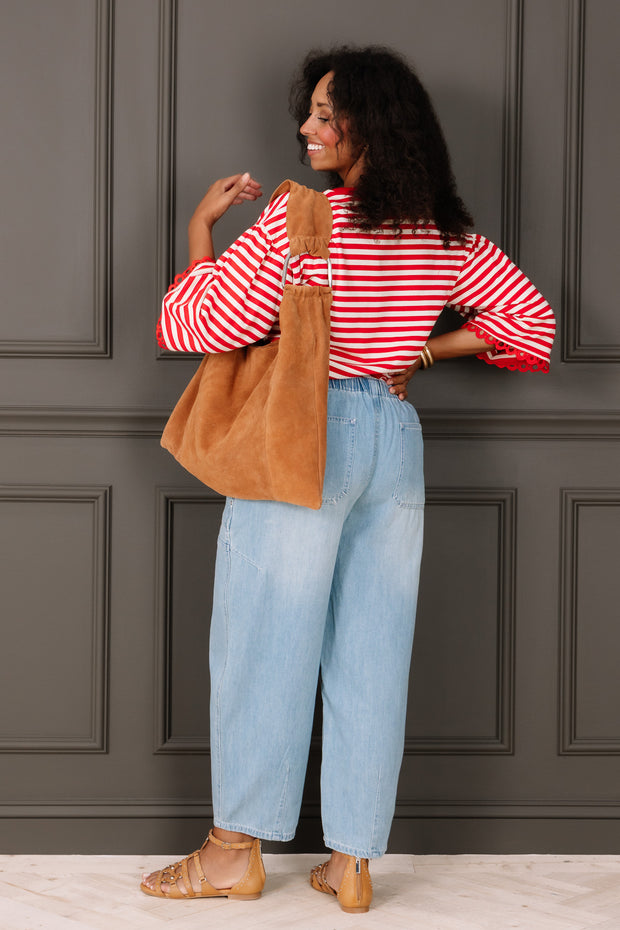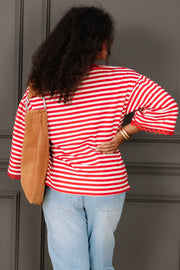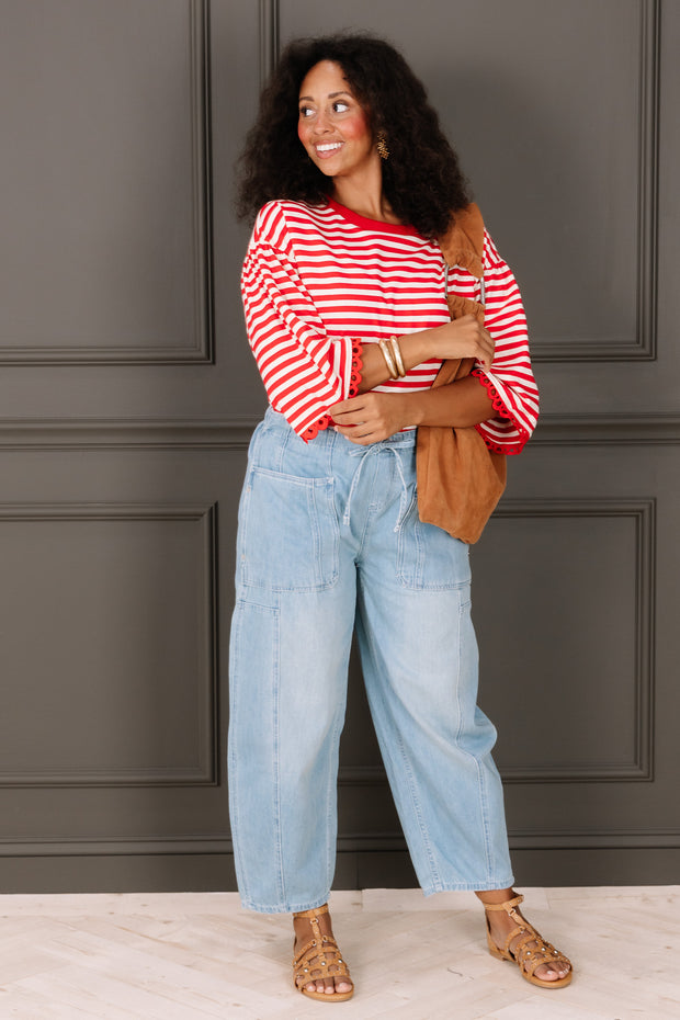 The Life For Me Red and White Striped Long Sleeve Top features a comfortable, breathable fabric with a classic round neckline. Red eyelet detailing along the sleeves adds a charming touch, making this top perfect for everyday wear with a subtle pop of style.