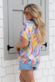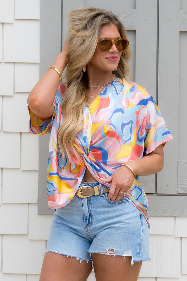 This top features a unique abstract print on a breathable material, perfect for warmer weather. The v neckline and sleeveless design create a flattering silhouette, while the tie knot front detail adds a touch of charm.