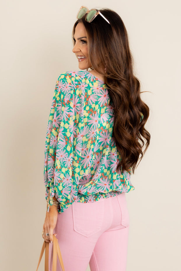 This stunning piece features a gorgeous waist length cut, long sleeves, and a v-neckline to accentuate your figure. The vibrant floral print adds a touch of sophistication to any outfit.