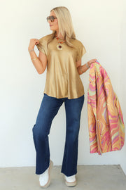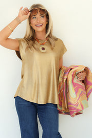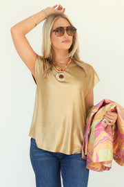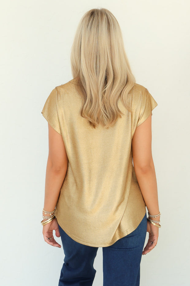 This Blouse features a rounded neckline and short sleeves for a comfortable fit. Its waist-length design paired with metallic material adds a touch of shine, making it perfect for both casual and dressy occasions.