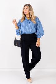 Blue metallic button-up top with short puff sleeves and a bust V-neckline. This statement piece combines shine and simplicity, perfect for adding effortless glam to your wardrobe.