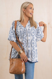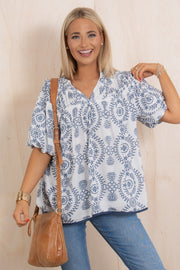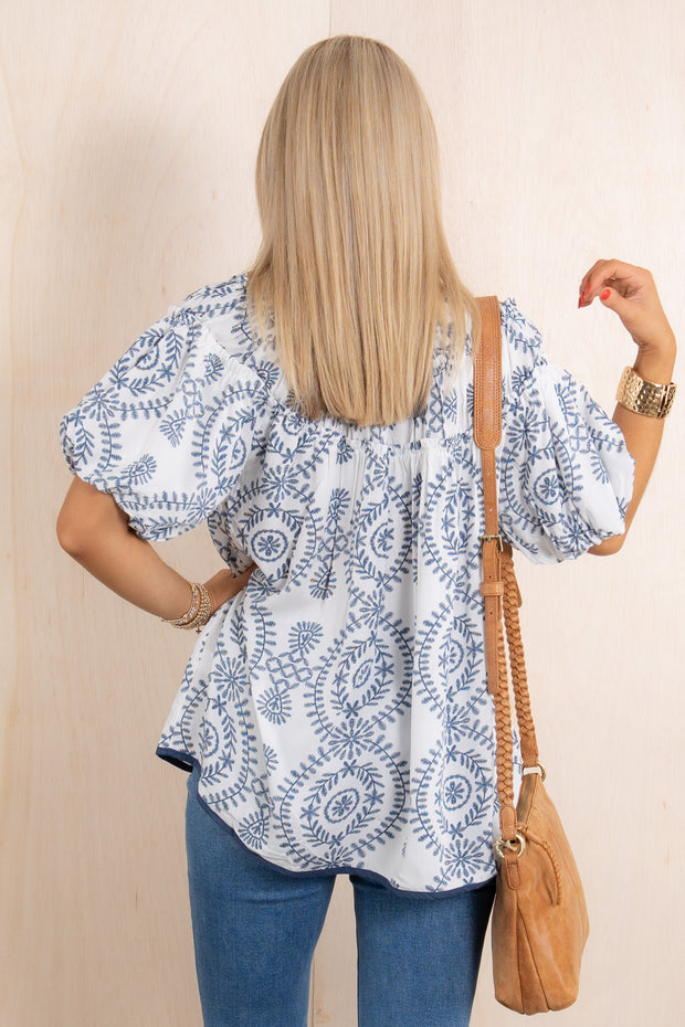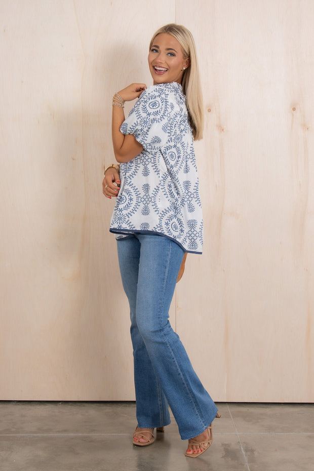 This navy top features a flattering v-neckline and short sleeves for everyday comfort. Delicate embroidered details add a touch of elegance, while the waist-length cut makes it perfect for pairing with jeans, skirts, or dress pants.