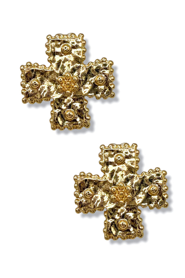 These gold cross earrings have a textured design that is both simple and bold, making them a stylish addition to any outfit.