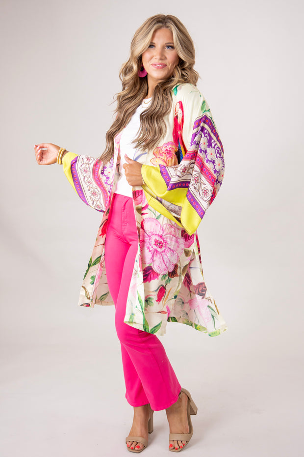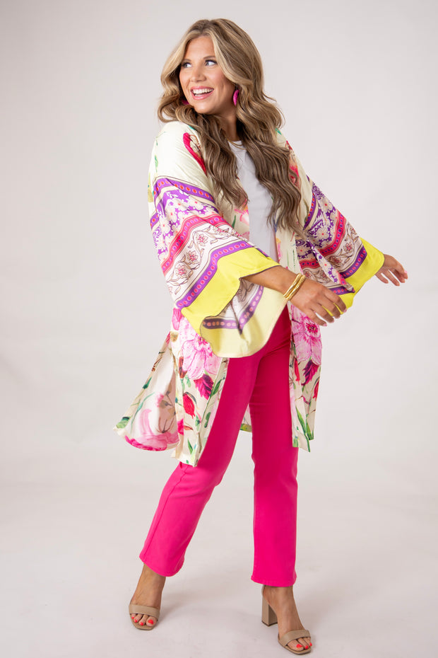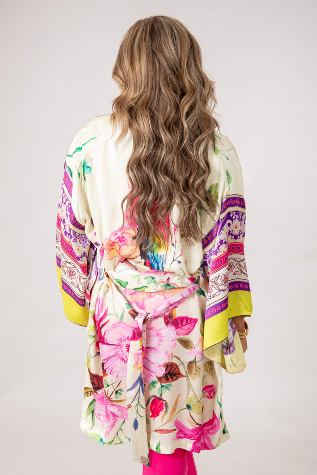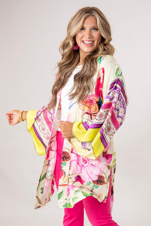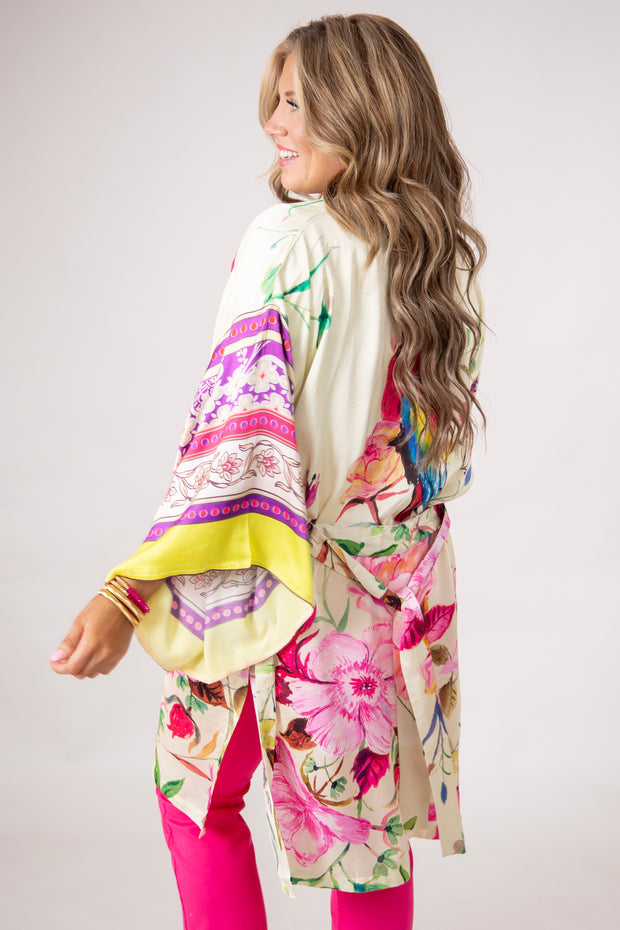 Expertly crafted with a parrot and floral print, the Speak Now Kimono is a must have belted kimono for any tropical mood. Adorned with delicate beading on the front and a stunning floral border on the sleeves, this piece exudes elegance and style. Embrace the island vibe with the Ivory Parrots Print.