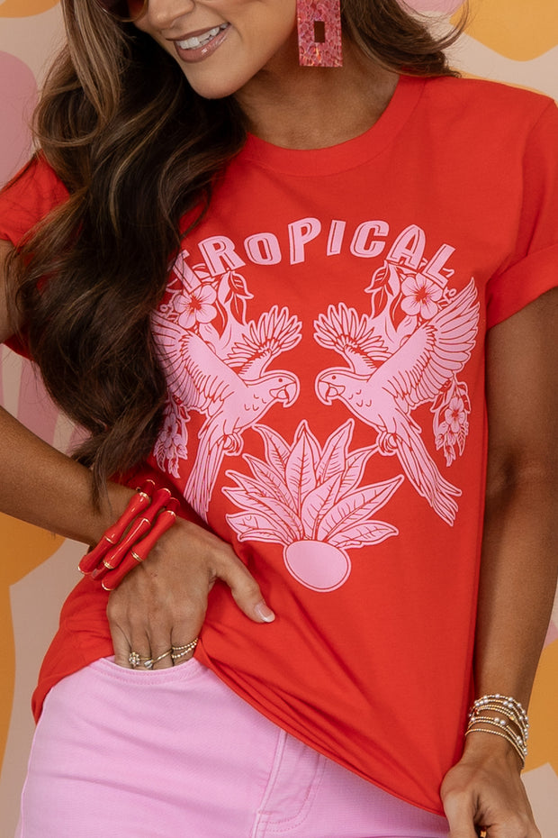 Featuring a rounded neckline and short sleeves, this waist-length tee is perfect for warm days and the vibrant tropical print adds a touch of exotic flair.