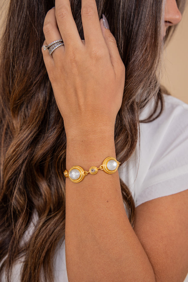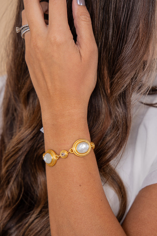 This opulent bracelet alternates between striking oval rose cut gems and delicate oval rose cut CZs, all set in a lightly hammered golden surround and finished with an adjustable toggle.