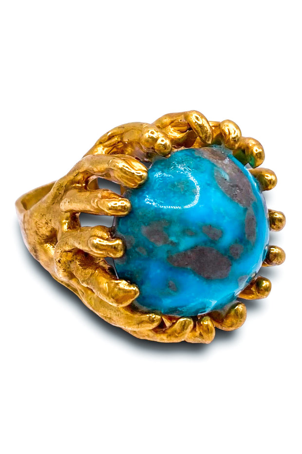 This statement ring features a beautiful turquoise stone set into a detailed gold setting. As a versatile accessory, it adds a pop of color to any outfit and is sure to impress with its eye-catching design. With its unique blend of bold and elegant, this ring is a must-have for any fashion-forward individual.