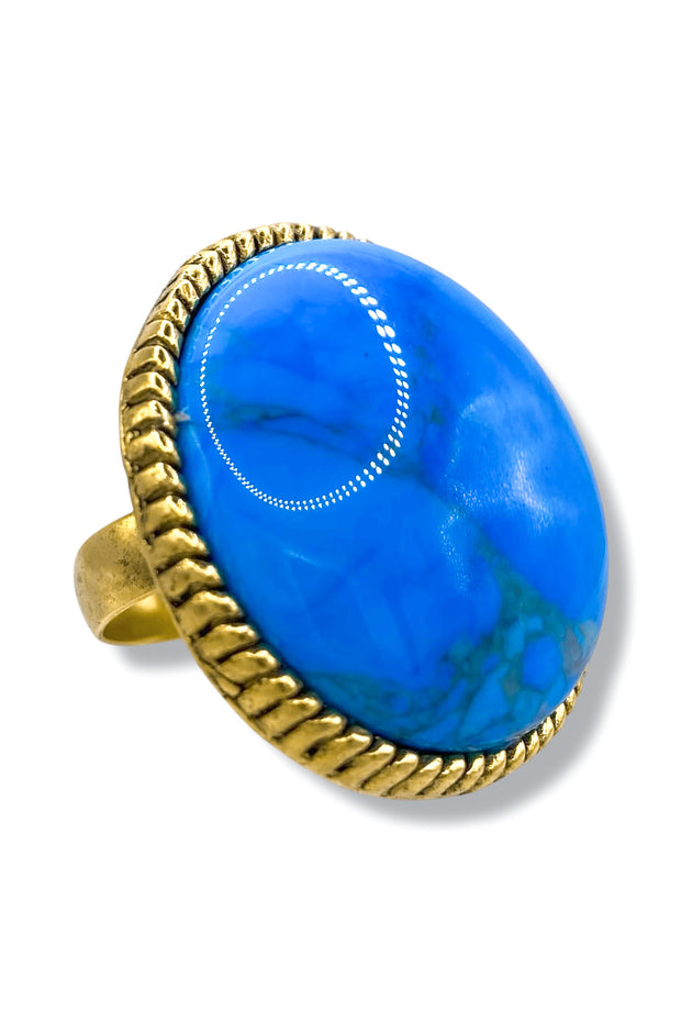 Made with a beautiful gold band and intricate turquoise detailing, the Yochi Talking To You Turquoise Ring is a stunning piece of jewelry. Add a pop of color to any outfit while enjoying the timeless elegance of this expertly crafted ring.