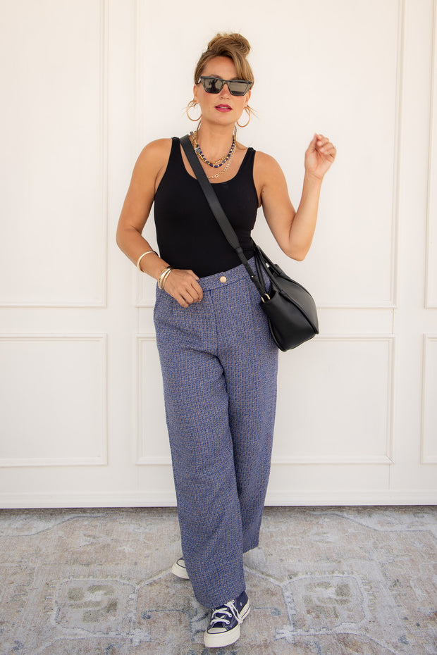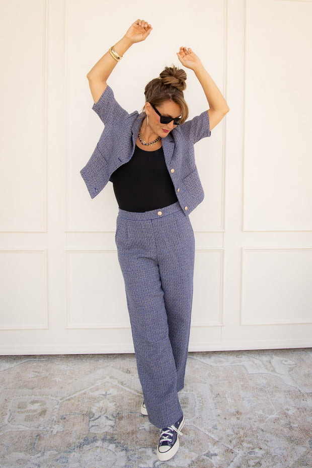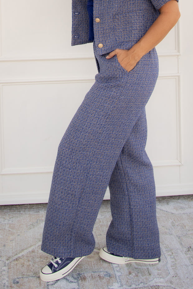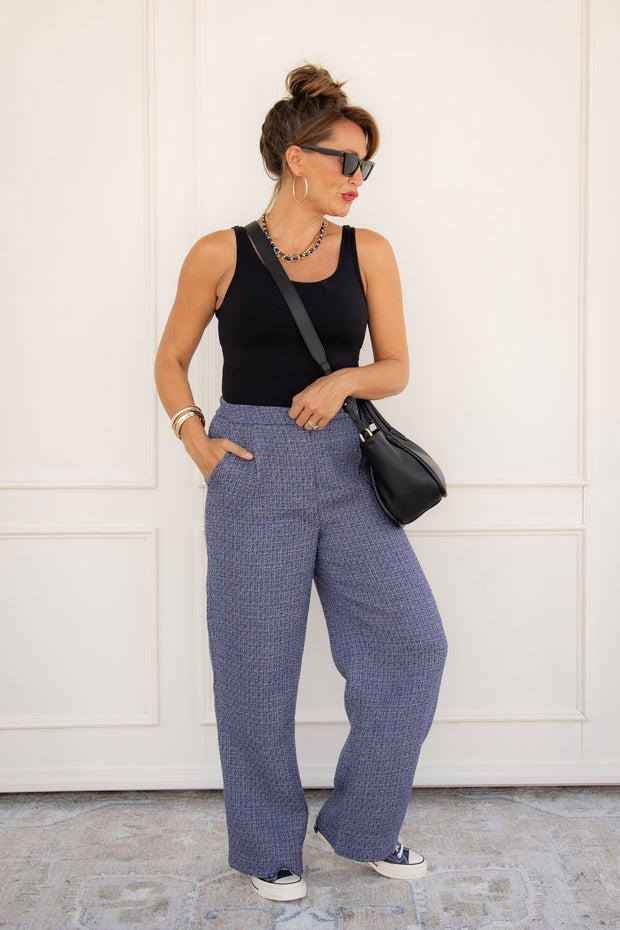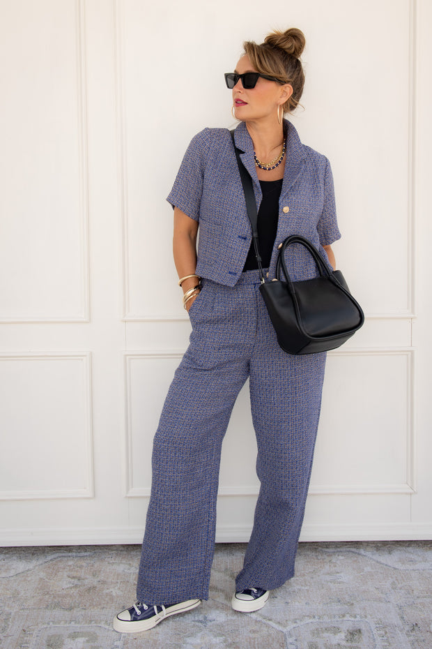 Slip into style with our I'm In Love Pants. Made from luxurious tweed material, these pants are perfect for any occasion. The wide leg design provides a comfortable and flattering fit, while the button and zipper closure adds a touch of sophistication. Plus, with pockets for convenience and the option to match back to our I'm In Love Cropped Blazer, these pants are a must-have in any wardrobe!