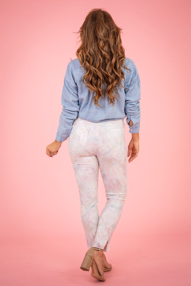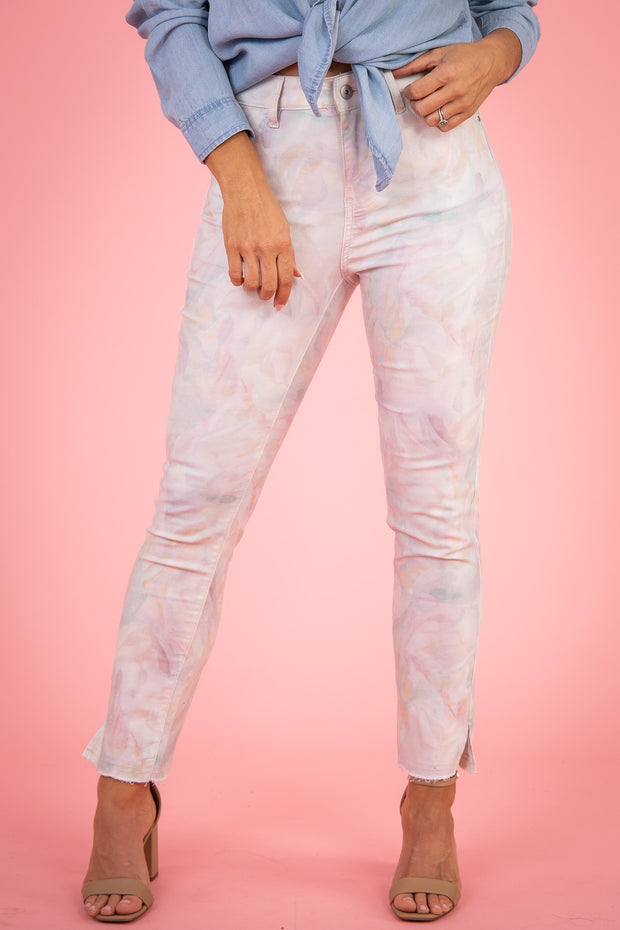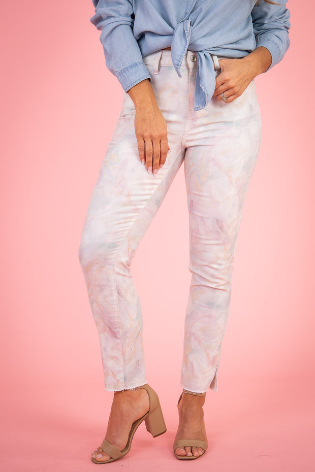 The Ashton Twill Ankle Pant offers a unique abstract print and is made with stretchy material for maximum comfort. Its front zip button closure ensures a secure fit, while functional pockets provide convenience. Complete with a raw hem line, these pants are a stylish addition to any wardrobe.