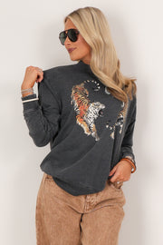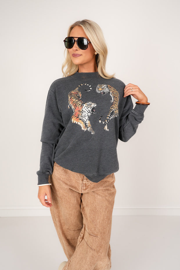 This Michaela Tiger Black Graphic Long Sleeve Top features a comfortable, soft fabric perfect for all-day wear. Its round neckline adds a classic touch, while the striking design of two tigers on the front makes it a standout piece. Ideal for casual outings or layering, this black long sleeve top combines style and comfort effortlessly.