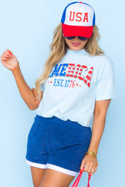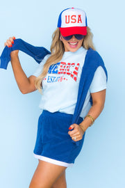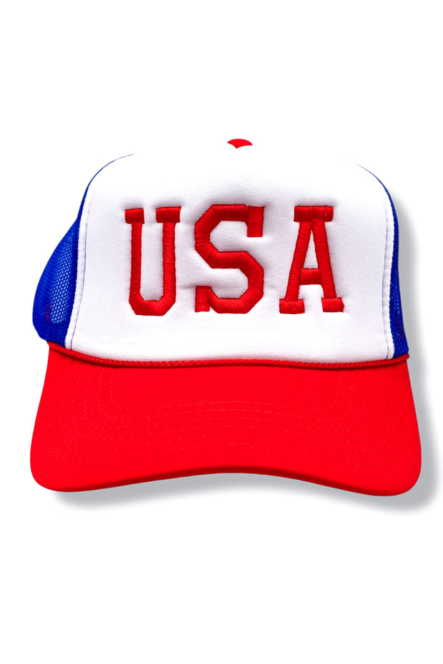 Celebrate your American pride with our USA Trucker Hat. This vibrant hat features a bold red, white, and blue design with an embroidered "USA" on the front. Show your patriotism with style and let everyone know where you're from. Perfect for Fourth of July or any patriotic event.