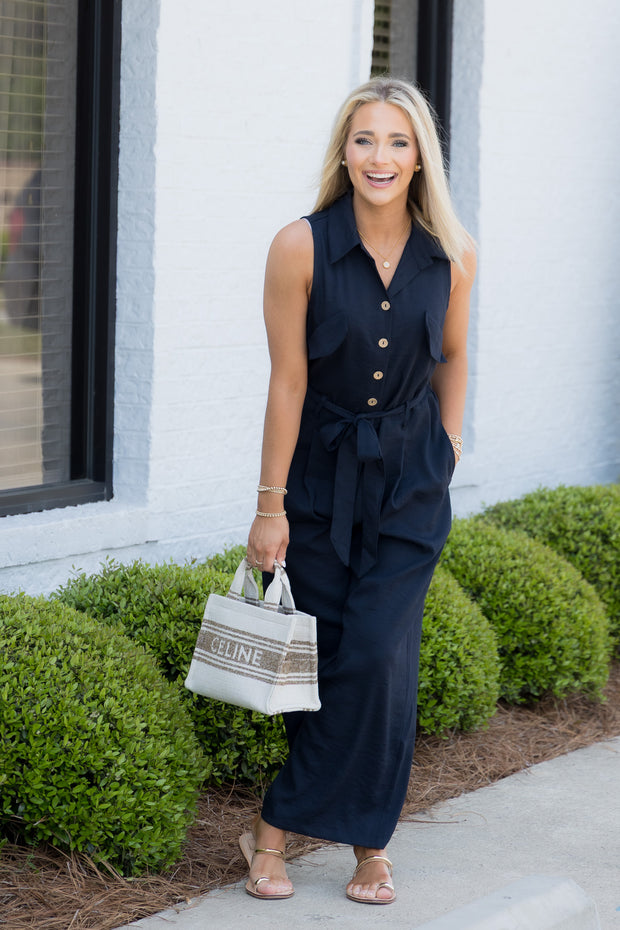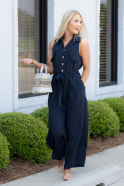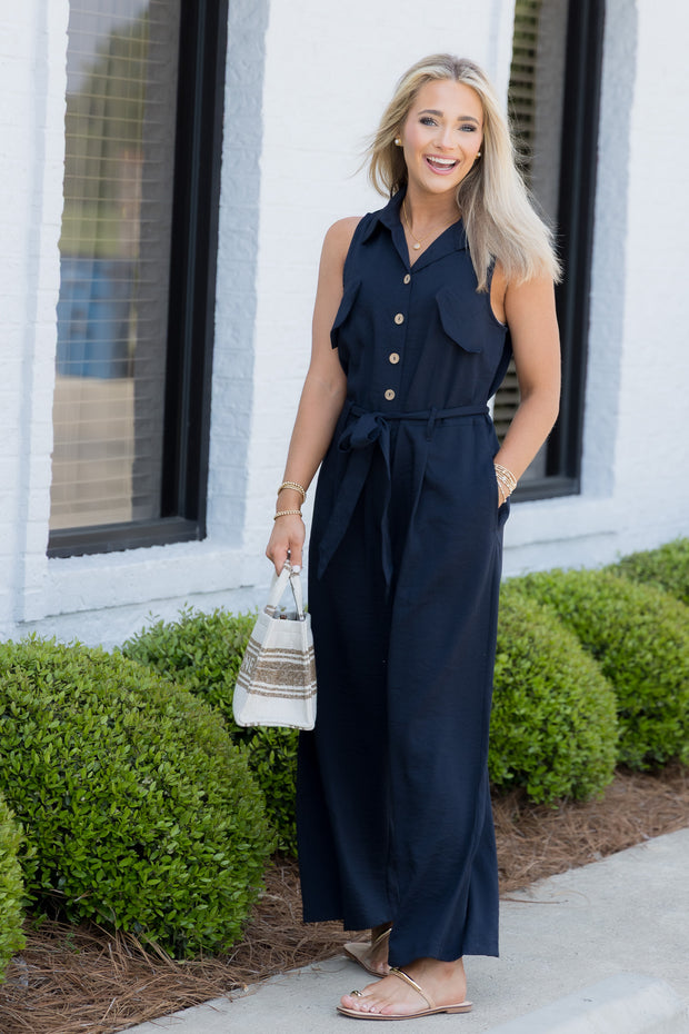 This jumpsuit features a v neckline and button down bust for a stylish and modern look. With faux top pockets, top collar, and sleeveless design, it's both functional and fashionable. The side pockets add convenience to this navy jumpsuit.