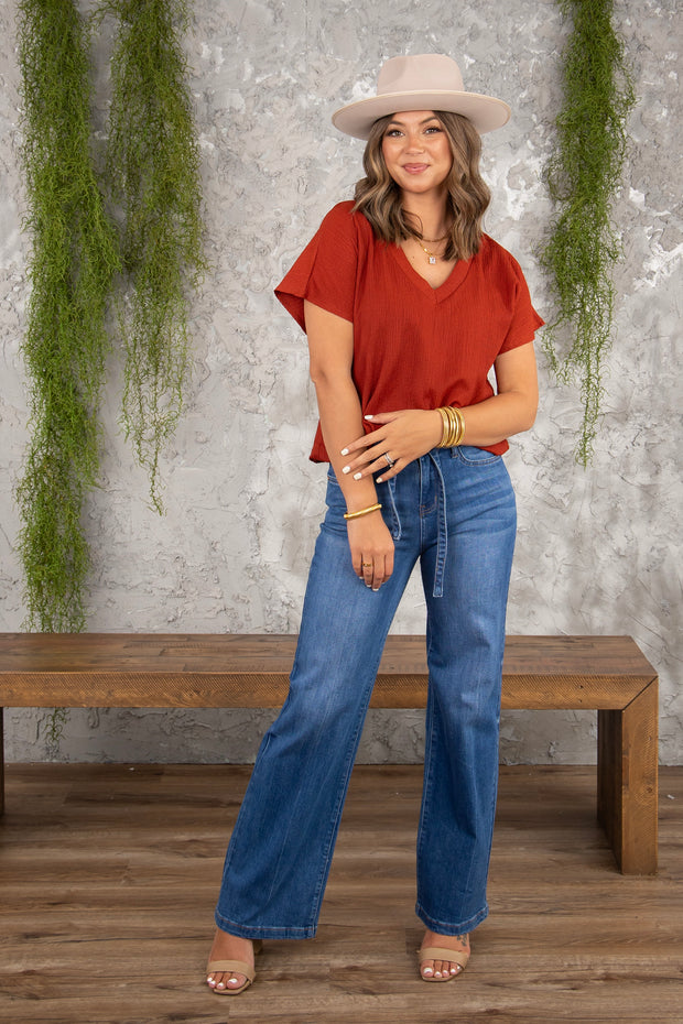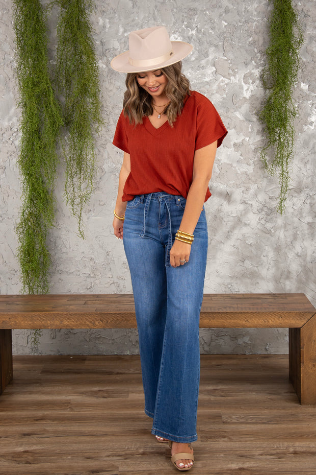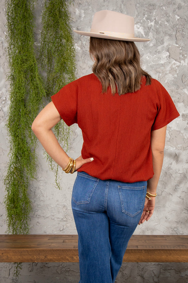 Experience the perfect blend of style and comfort with our Sweet Like Cinnamon V-Neck Top. Designed with a flattering v-neckline and trendy short sleeves, this top boasts a textured material that adds dimension to any outfit. The elastic banded bottom ensures a comfortable and secure fit, making it a must-have addition to your wardrobe.