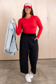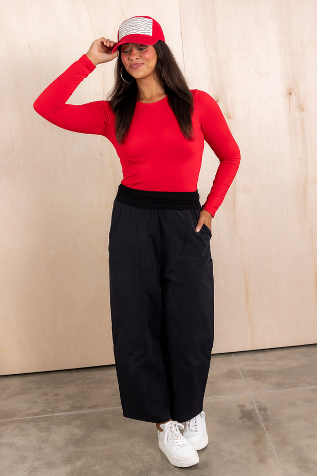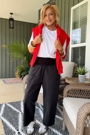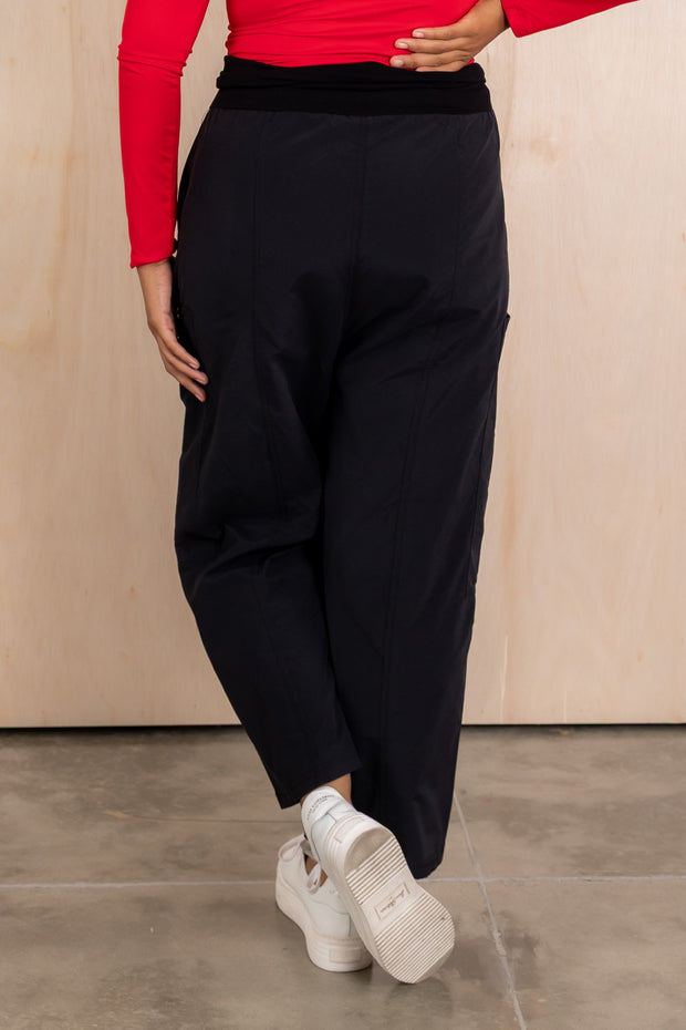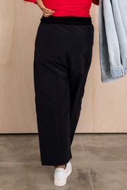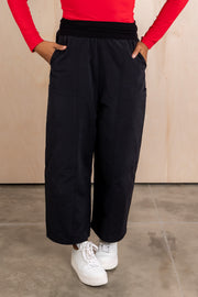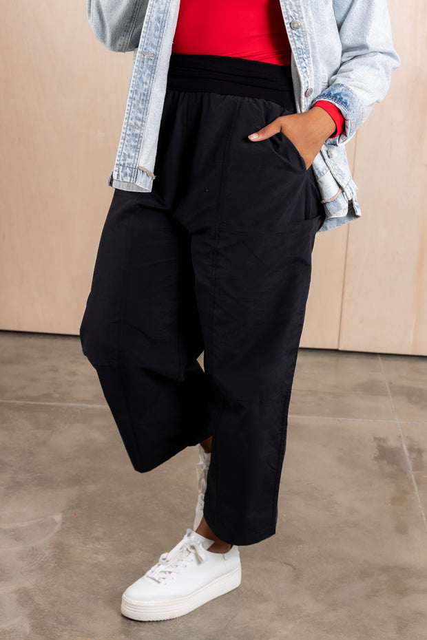These Pants offer a comfortable high waist with an elastic pull-on waistband. Featuring side pockets and a cropped silhouette, these pants combine practicality with a modern, relaxed style.