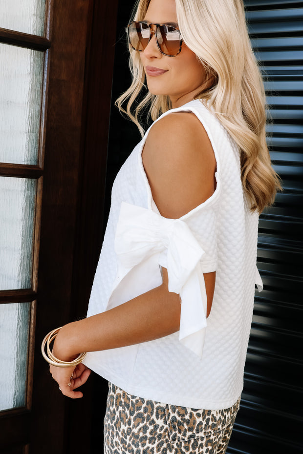 This white short sleeve top features a round neckline and stylish shoulder cutouts with bow details. Made from comfortable material, it offers a relaxed fit perfect for everyday wear.