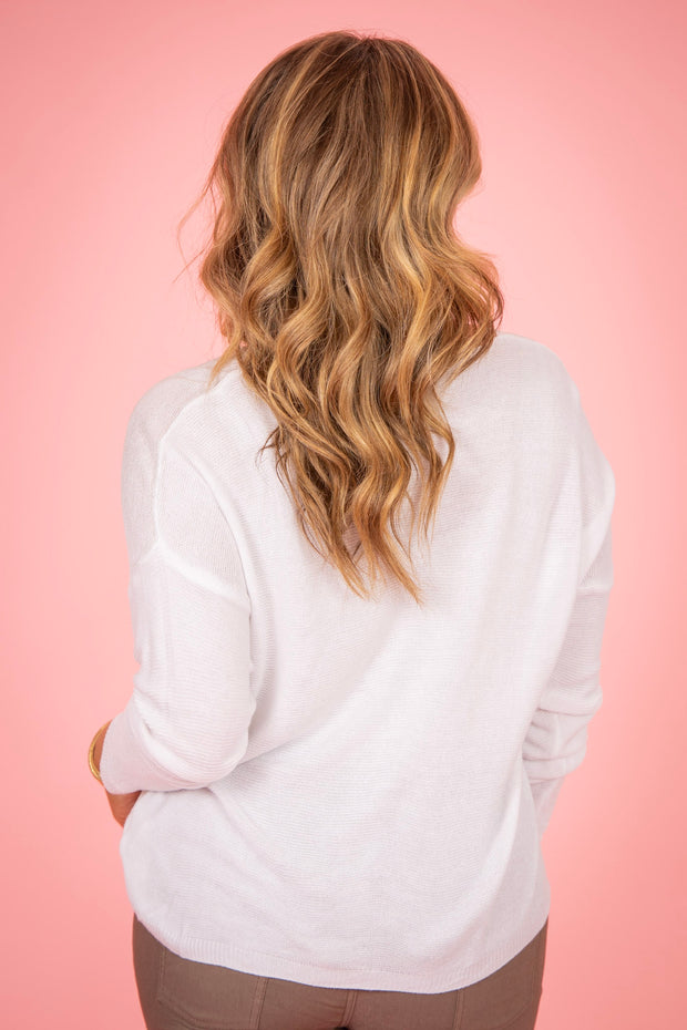 Introducing the Falling For You Sweater. Stay stylish and cozy with this lightweight knit sweater featuring a flattering v-neckline and long sleeves, perfect for any occasion. The metallic material adds a touch of shimmer, making it a must-have for your wardrobe.