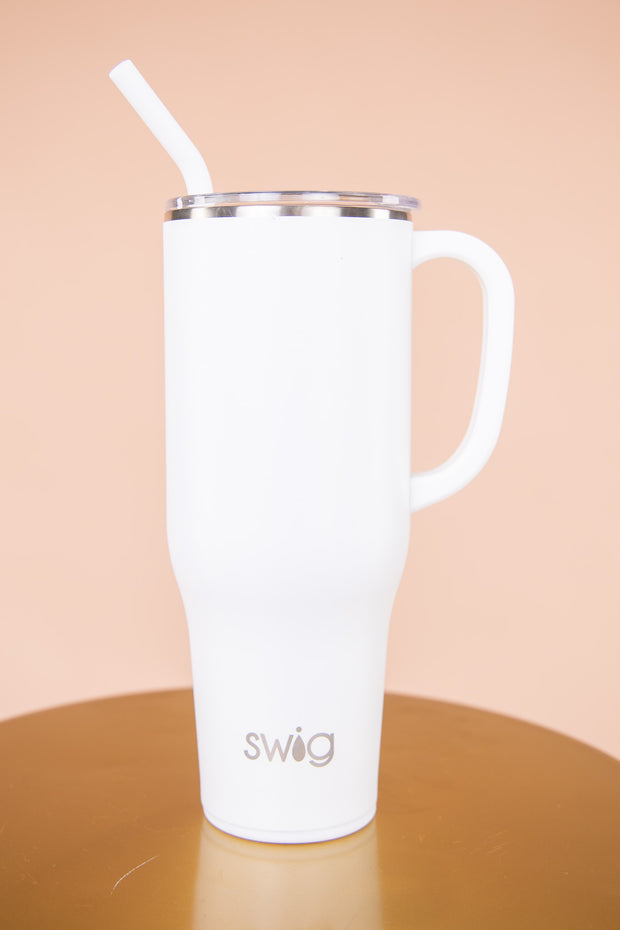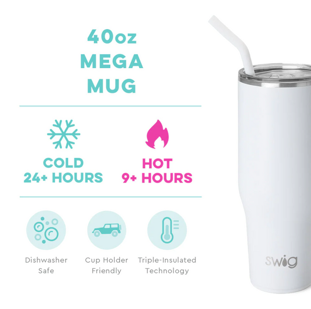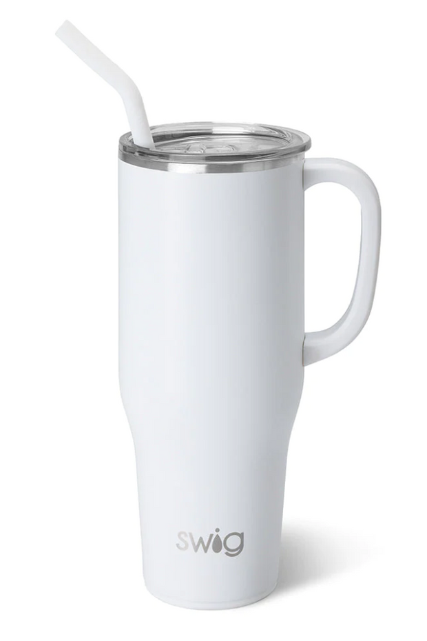 Mega sips, less refills! Enjoy a soft, matte finish in this perfect color White. Hydrating has never been easier with our 40oz Mega Mug! The cup holder friendly frame, comfort-grip handle and flexi-tip straw come together to create your new favorite Swig!