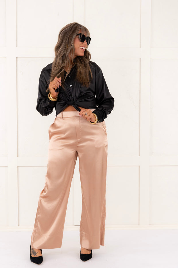 Expertly crafted from luxurious satin material, these Make It Right wide leg pants in sleek brush are a perfect wardrobe staple. With an elastic pull on waistband and a flattering wide leg silhouette, these pants offer both comfort and style. Elevate your look with these statement pants.