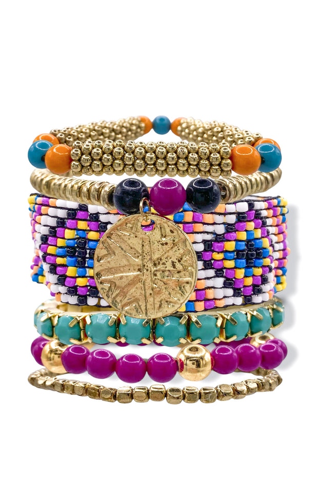 How fun is this chunky bracelet stack? It's full of so much fun and versatility. Featuring aztec, tons of bead work and a coin pendant. This entire set makes for a fire stack.
