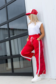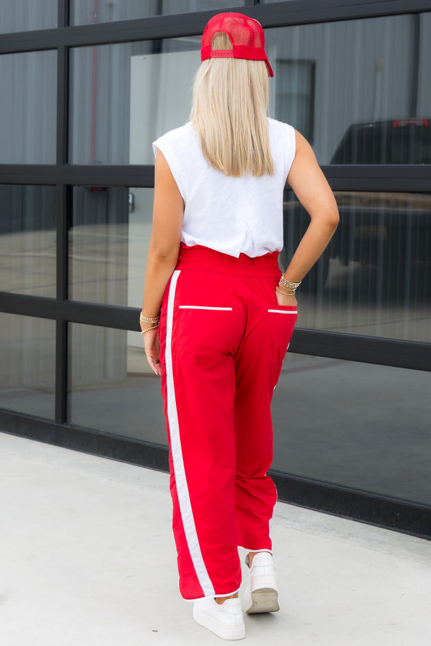 Its high waist and pull on waistband offer a comfortable fit, while the windbreaker material and side pockets provide protection and functionality.