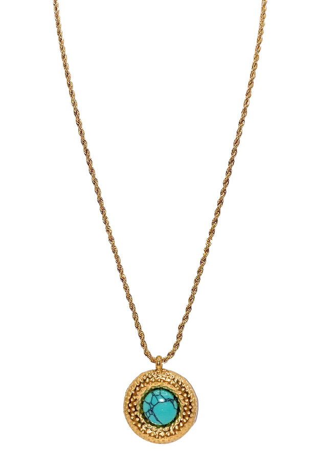 Elevate your style with the Windfall Necklace in turquoise. This bold pendant adds a pop of color to any outfit, while its rope chain design makes it perfect for layering with other necklaces. Make a statement with this stunning piece that is sure to turn heads.