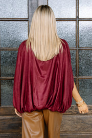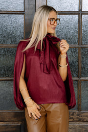 The Here They Come top features a wine metallic sleeveless design with a high neckline, tie detail, and cape overlay, crafted from breathable, comfortable fabric for elegant wear.