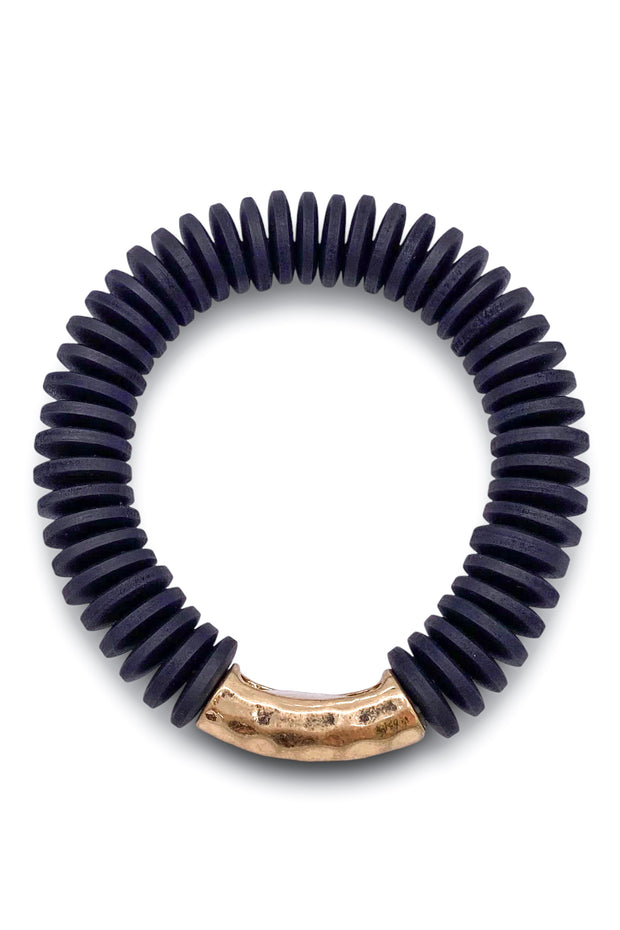 Upgrade your style with the Long Road Bracelet in Black. This wooden bracelet features a statement gold bead that adds a touch of sophistication to any outfit. Elevate your look and make a statement with this unique piece.