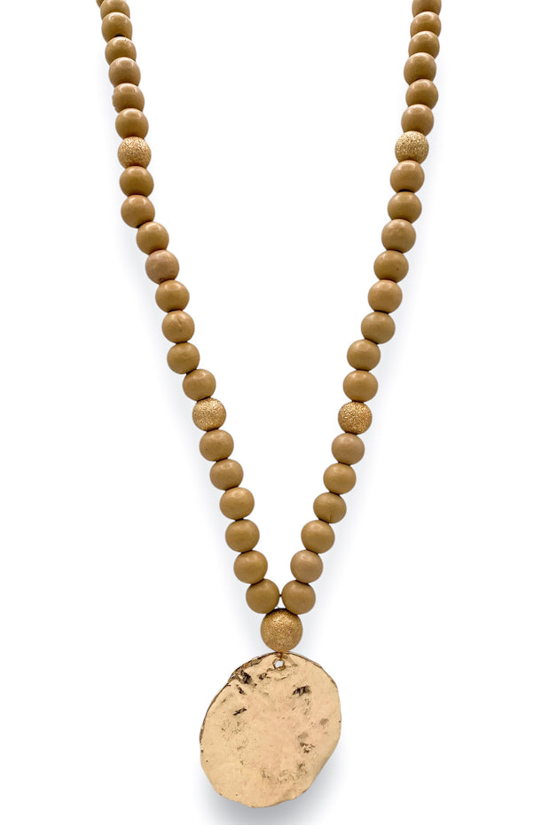 This High Tide Necklace features a unique Textured Disc pendant on a wood beaded necklace. Crafted with natural materials, this necklace is perfect for adding a touch of nature to your wardrobe. With its versatile design, it can be dressed up or down, making it a must-have accessory for any occasion.