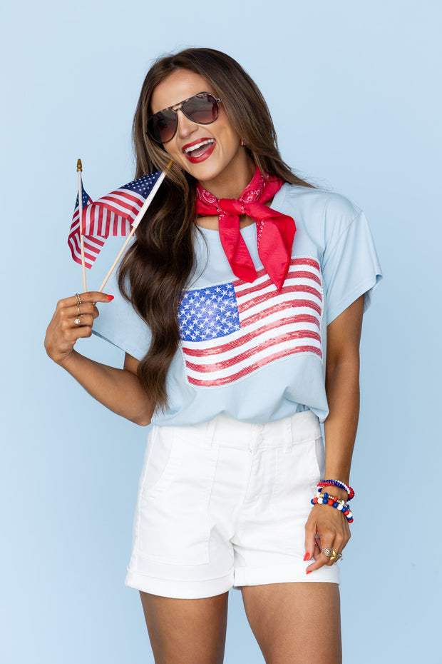 This TWT X QOS Exclusive Tee features a rounded neckline, short sleeves, and sequin American Flag detailing on the front. Its waist length and comfortable fit make it perfect for any patriotic occasion and adds a touch of sparkle to any outfit.