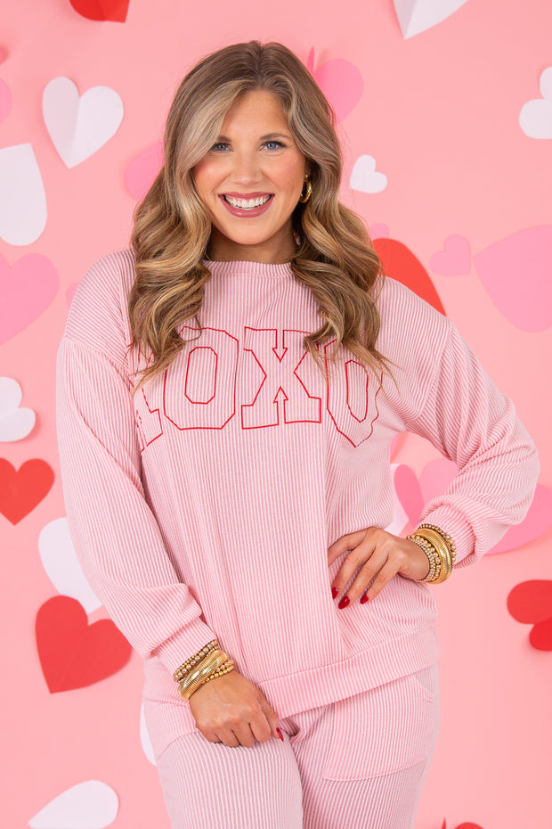 The XOXO Top is designed with a round neckline and long sleeves to enhance your style. The XOXO wording detailing throughout adds a stylish flair, while the stretchy ribbed material provides a perfect fit. Keep your look timeless and classic with this top.
